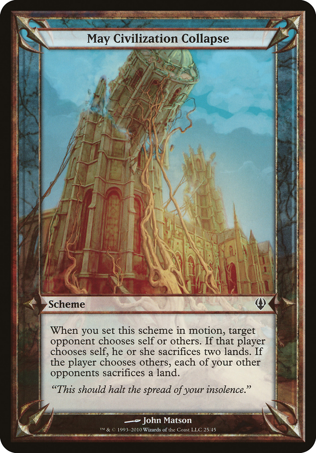 When you set this scheme in motion, target opponent chooses self or others. If that player chooses self, that player sacrifices two lands. If the player chooses others, each of your other opponents sacrifices a land.