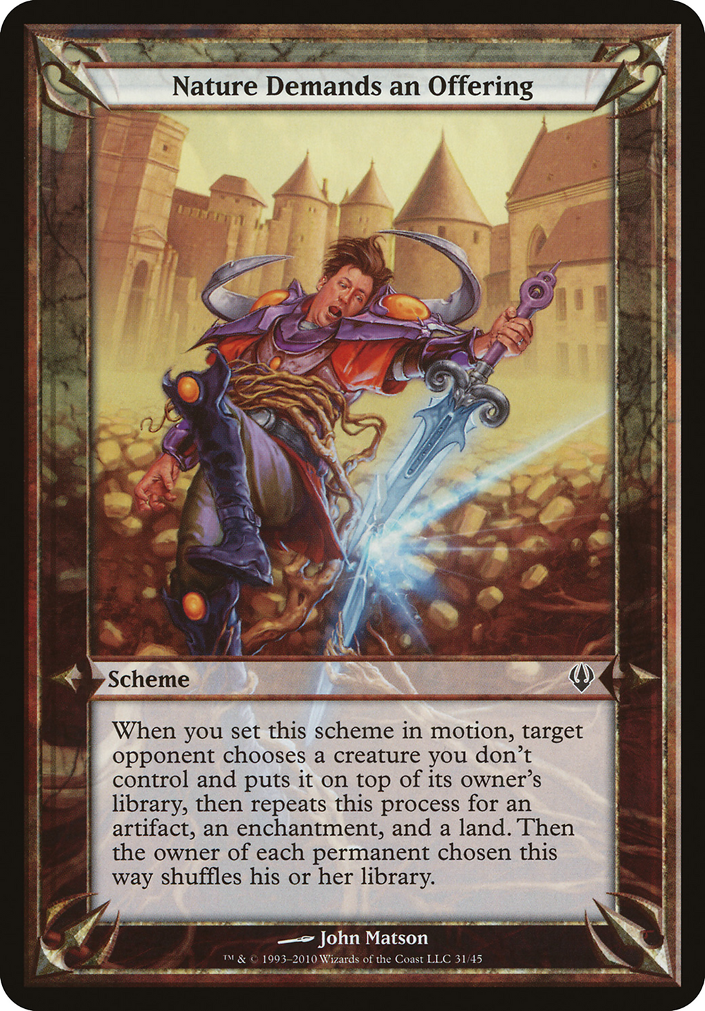 When you set this scheme in motion, target opponent chooses a creature you don't control and puts it on top of its owner's library, then repeats this process for an artifact, an enchantment, and a land. Then the owner of each permanent chosen this way shuffles their library.