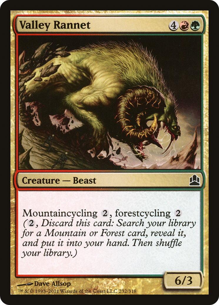 Mountaincycling {2}, forestcycling {2} ({2}, Discard this card: Search your library for a Mountain or Forest card, reveal it, put it into your hand, then shuffle your library.)