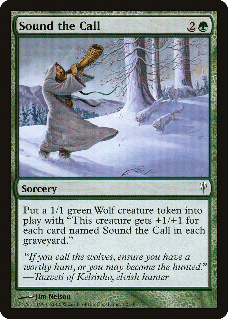 Create a 1/1 green Wolf creature token. It has "This creature gets +1/+1 for each card named Sound the Call in each graveyard."