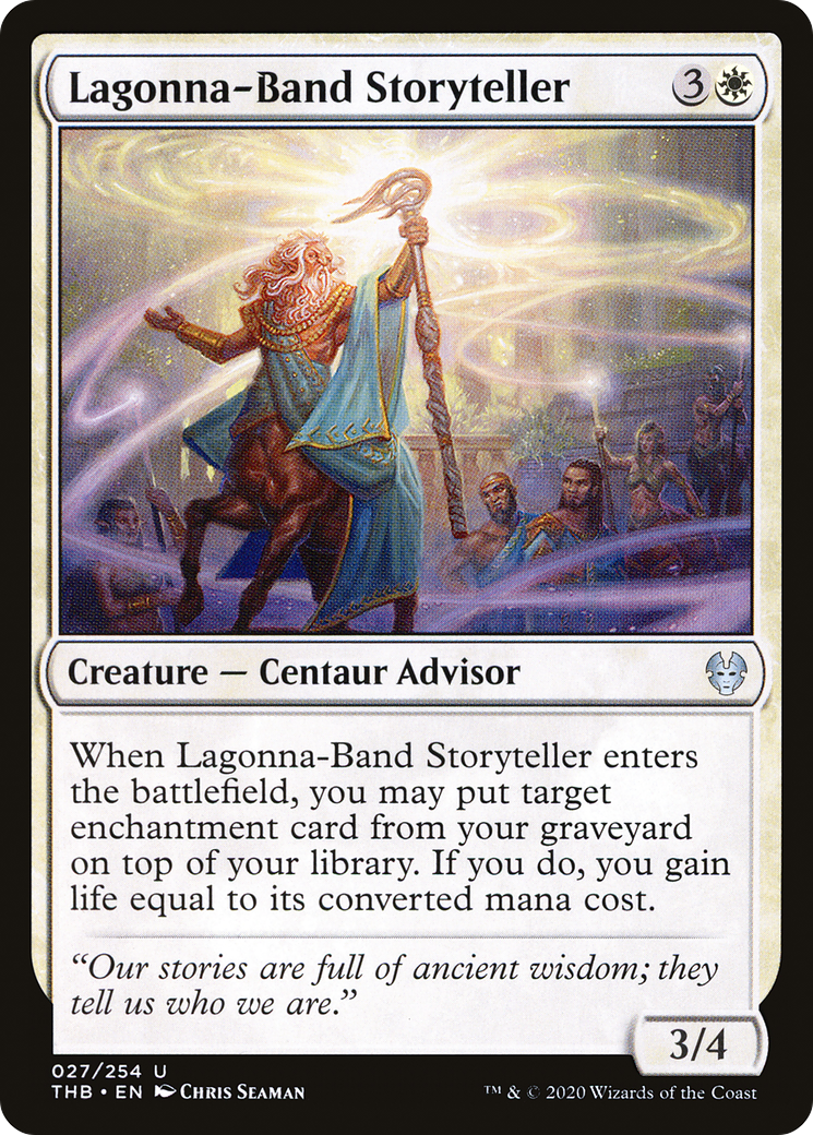 When Lagonna-Band Storyteller enters the battlefield, you may put target enchantment card from your graveyard on top of your library. If you do, you gain life equal to its converted mana cost.