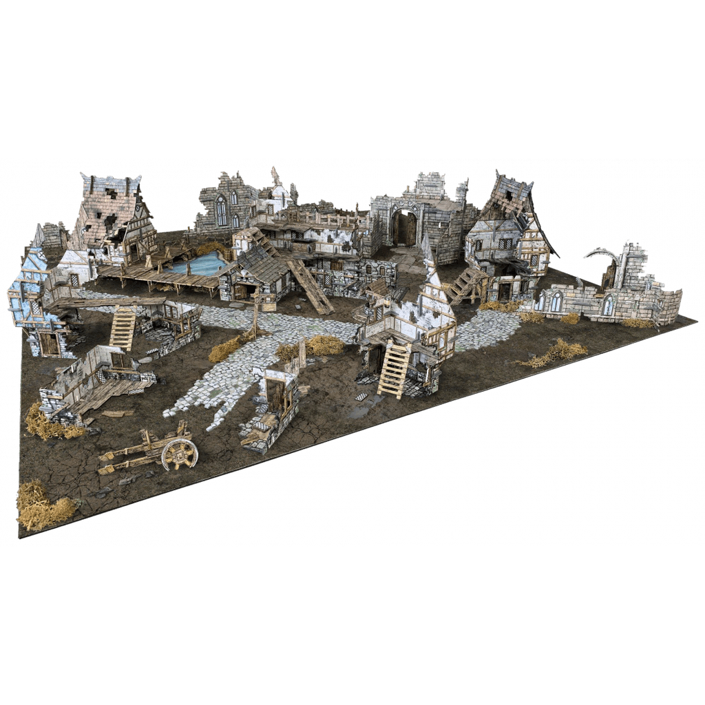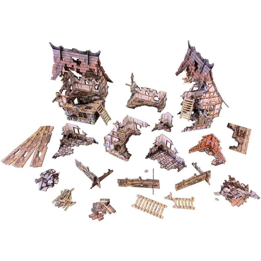 This box contains everything you need to turn your gaming table into a devastated town, suitable for many 28-35mm fantasy and historical games. The set can be used on its own to create a heavily ruined settlement, or the modular pieces can be combined with the other Fantasy Village buildings to partially ruin a whole town! The set includes walkways, ladders and other scatter terrain to accessorise your table.