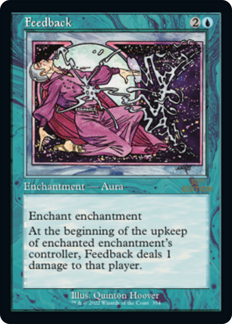 At the beginning of the upkeep of enchanted enchantment's controller, Feedback deals 1 damage to that player.