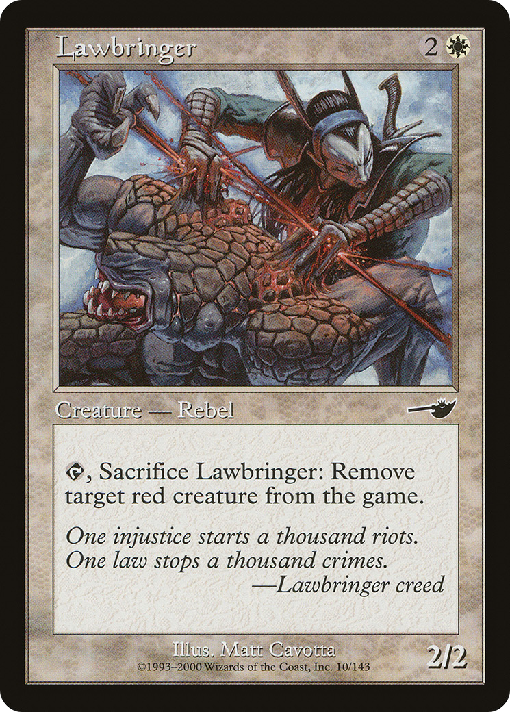 {T}, Sacrifice Lawbringer: Exile target red creature.