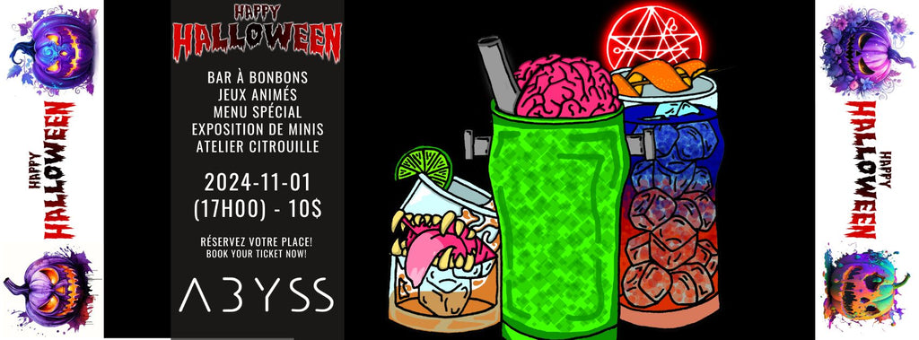 Venez profiter des activités d'halloween dans les profondeurs de l'Abyss. Bar à bonbons, exposition de miniatures, atelier citrouille, jeux de groupe animés, repas et boissons spéciales... On vous attends à partir de 17h, jusqu'à la fermeture !