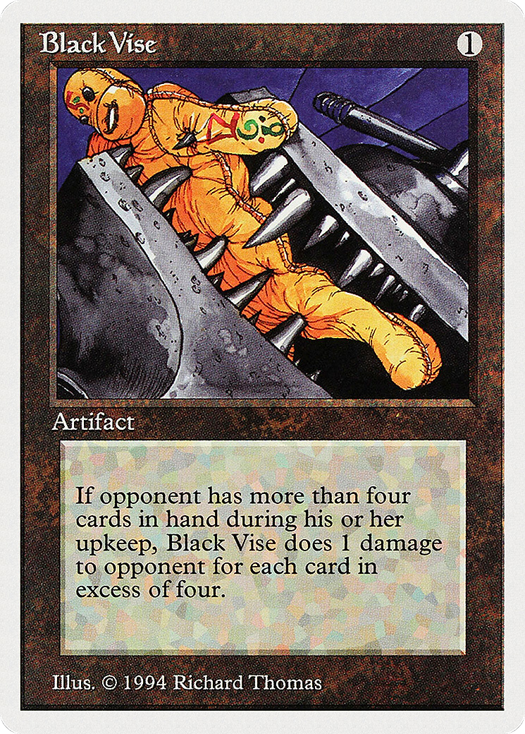 At the beginning of the chosen player's upkeep, Black Vise deals X damage to that player, where X is the number of cards in their hand minus 4.