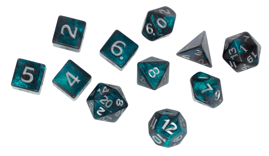 Eleven dice (two d20s, one d12, two d10s, one d8, four d6s, one d4)