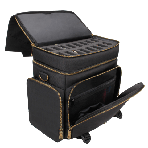 The top compartment of the bag features a miniature figure storage space with an included foam organizer capable of holding 16 28mm miniature figures. This section is ideal for storing preferred minis, player characters, NPC’s, or the party’s next challengers.