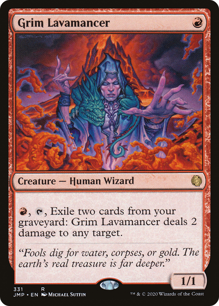 {R}, {T}, Exile two cards from your graveyard: Grim Lavamancer deals 2 damage to any target.