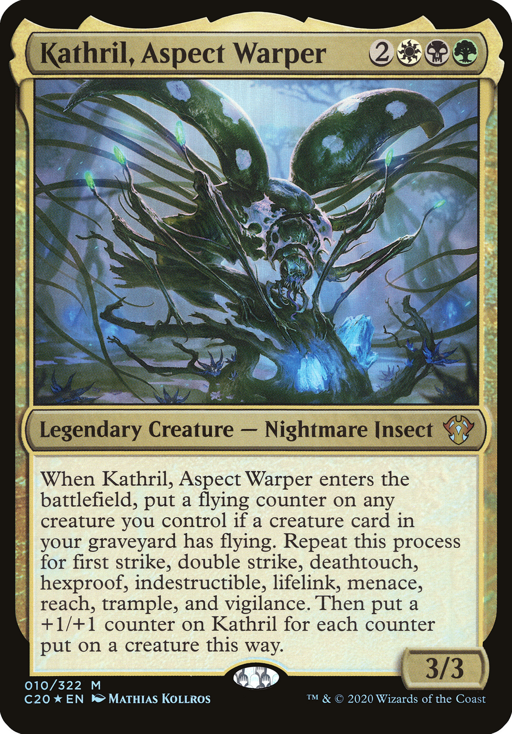 When Kathril, Aspect Warper enters the battlefield, put a flying counter on any creature you control if a creature card in your graveyard has flying. Repeat this process for first strike, double strike, deathtouch, hexproof, indestructible, lifelink, menace, reach, trample, and vigilance. Then put a +1/+1 counter on Kathril for each counter put on a creature this way.