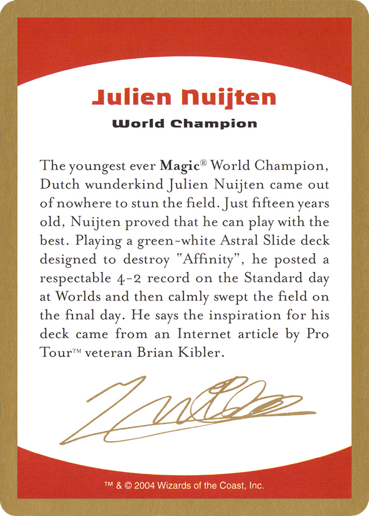 The youngest ever Magic® World Champion, Dutch wunderkind Julien Nuijten came out of nowhere to stun the field. Just fifteen years old, Nuijten proved that he can play with the best. Playing a green—white Astral Slide deck designed to destroy "Affinity", he posted a respectable 4-2 record on the Standard day at Worlds and then calmly swept the field on the final day. He says the inspiration for his deck came from an Internet article by Pro Tour™ veteran Brian Kibler.