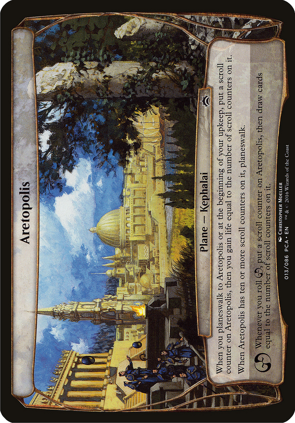 When you planeswalk to Aretopolis or at the beginning of your upkeep, put a scroll counter on Aretopolis, then you gain life equal to the number of scroll counters on it.