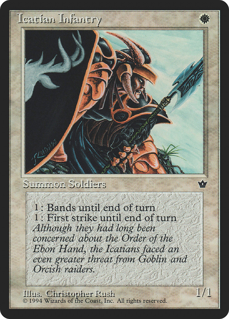 {1}: Icatian Infantry gains banding until end of turn. (Any creatures with banding, and up to one without, can attack in a band. Bands are blocked as a group. If any creatures with banding you control are blocking or being blocked by a creature, you divide that creature's combat damage, not its controller, among any of the creatures it's being blocked by or is blocking.)