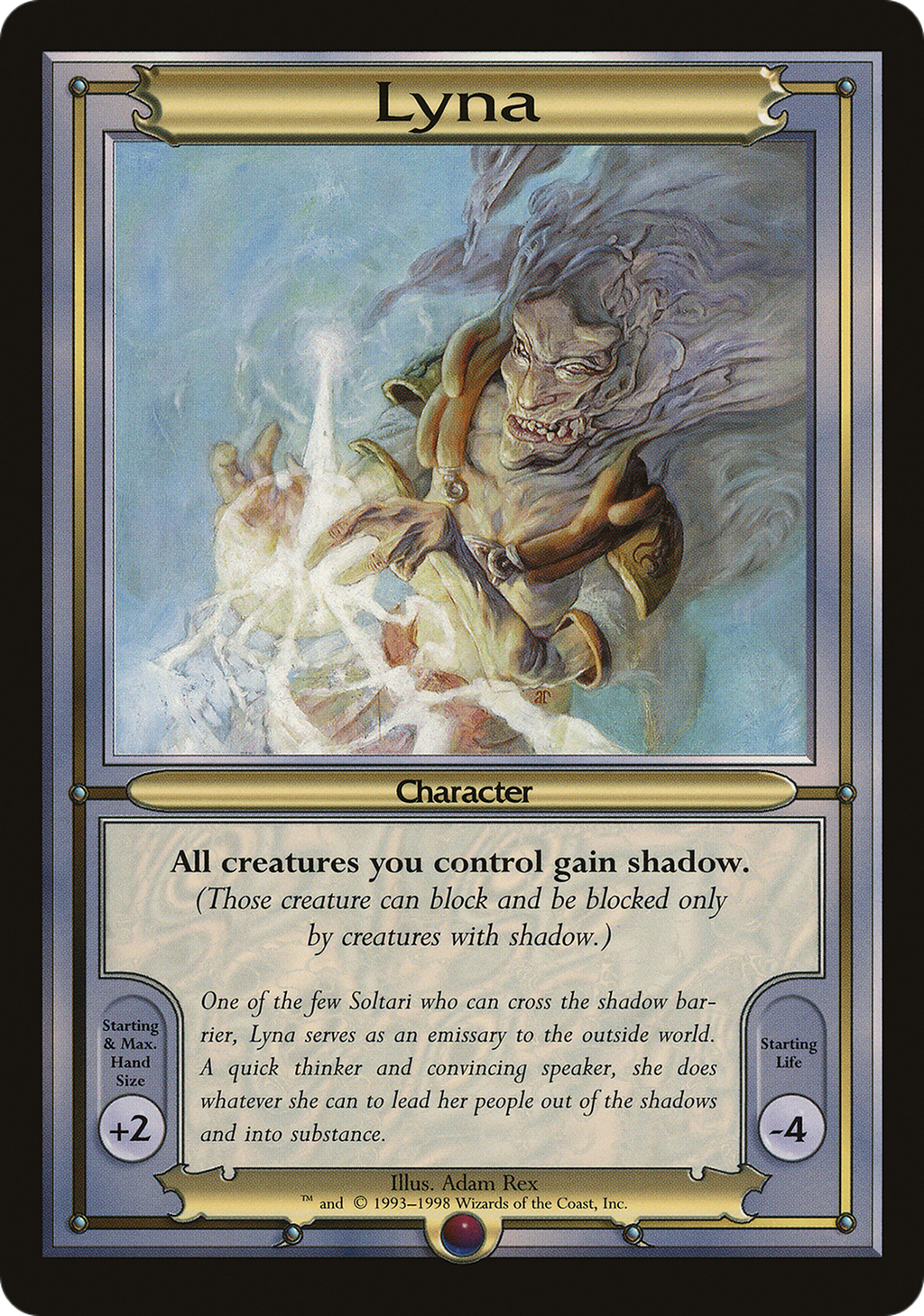 One of the few Soltari who can cross the shadow barrier, Lyna serves as an emissary to the outside world. A quick thinker and convincing speaker, she does whatever she can to lead her people out of the shadows and into substance.