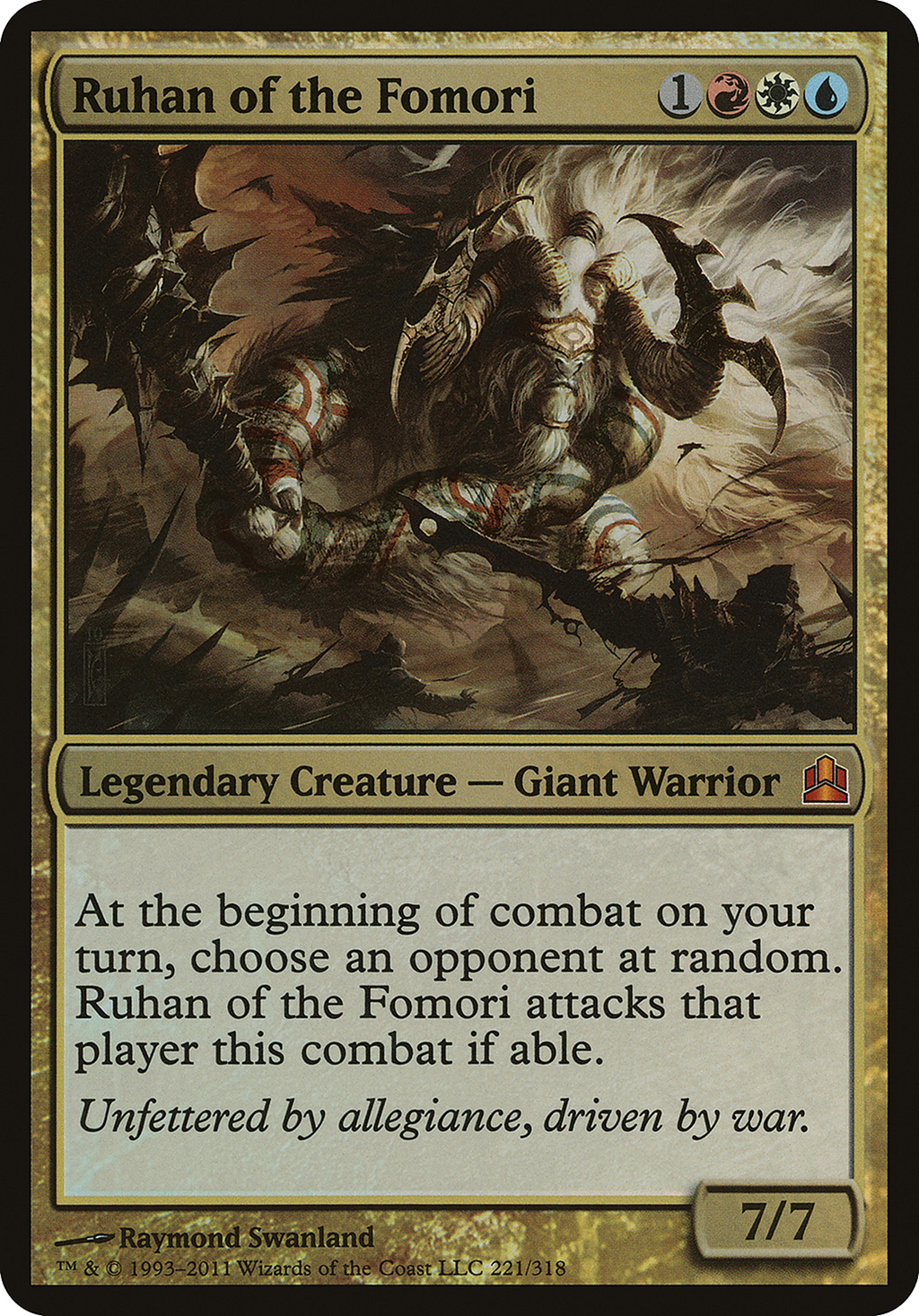 At the beginning of combat on your turn, choose an opponent at random. Ruhan of the Fomori attacks that player this combat if able.