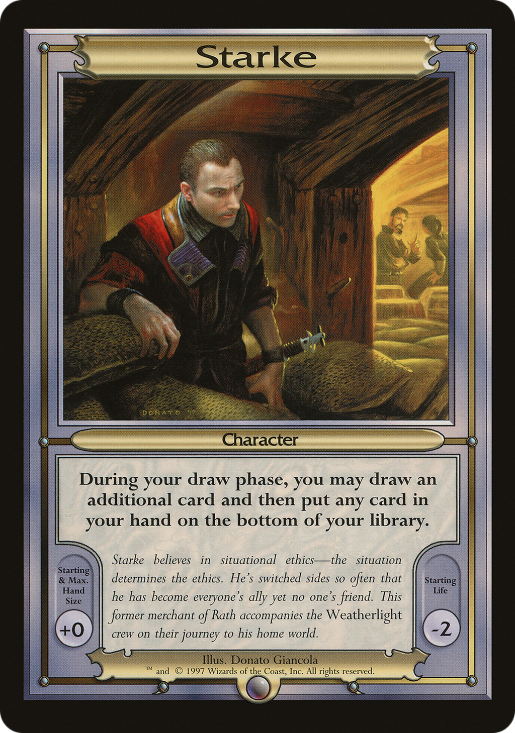 Starke believes in situational ethics—the situation determines the ethics. He's switched sides so often that he has become everyone's ally yet no one's friend. This former merchant of Rath accompanies the *Weatherlight* crew on their journey to his home world.