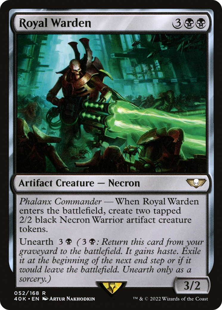 Phalanx Commander — When Royal Warden enters the battlefield, create two tapped 2/2 black Necron Warrior artifact creature tokens.