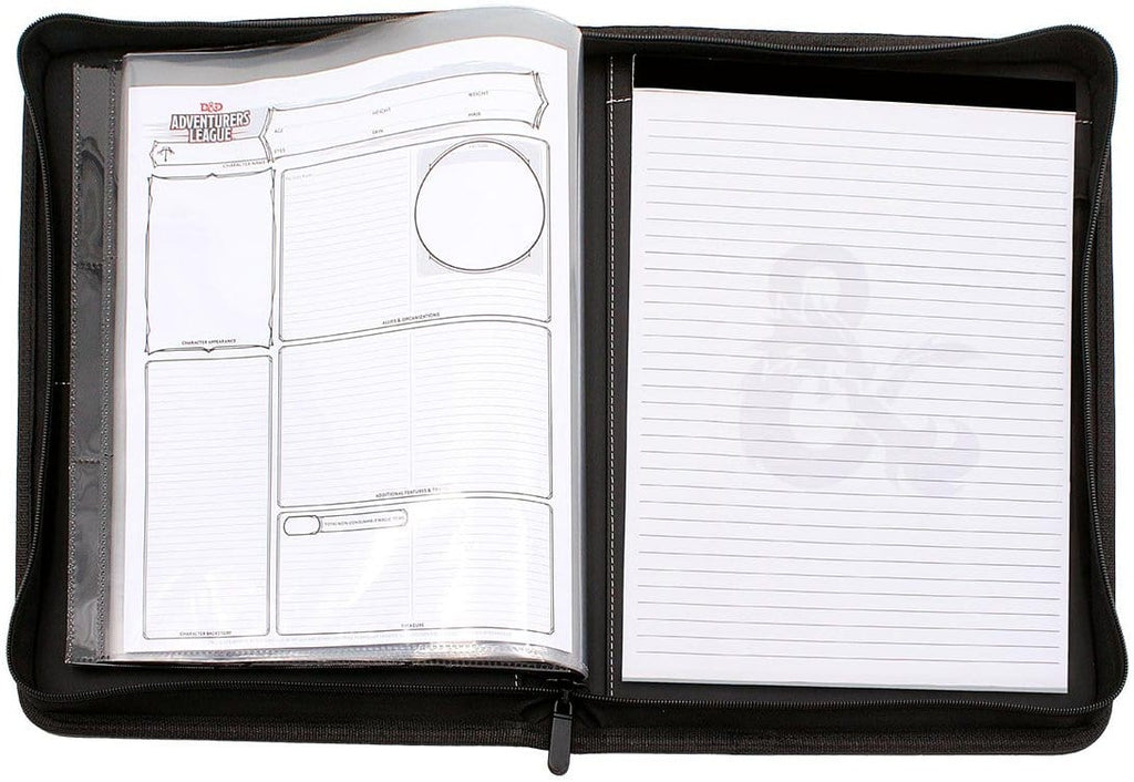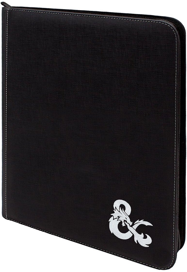 Zippered design for securing your D&D materials stored within. Includes 10 1-Pocket Pages for 8 1/2" x 11" character sheets and 6 18-pocket sheets for standard size Spell Cards. Also includes an official Dungeons and Dragons notepad and areas to store pens and pencils.